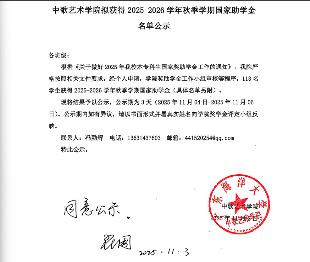 中歌艺术学院拟获得2025-2026学年秋季学期国家助学金名单公示