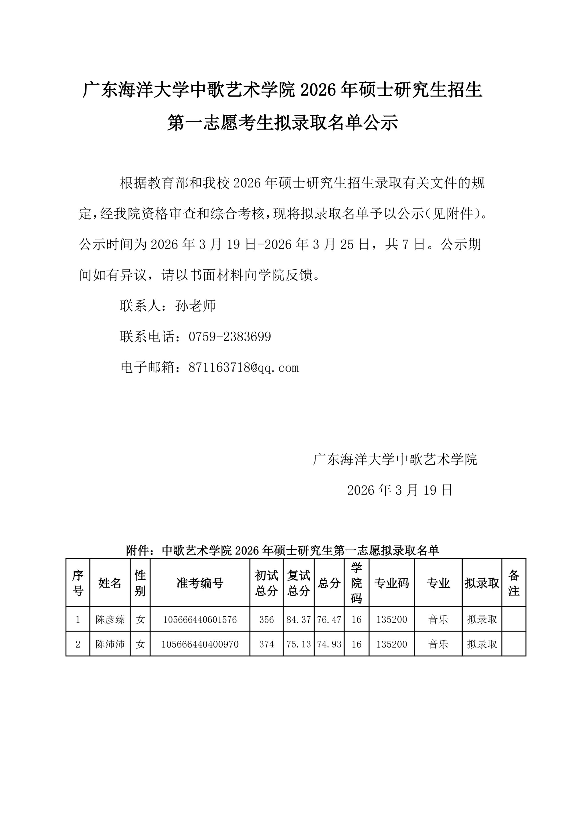 中歌艺术学院2026年硕士研究生第一志愿拟录取名单公示