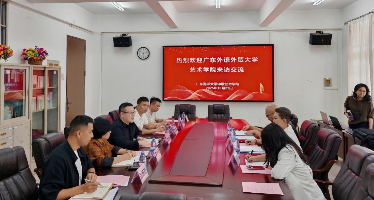 10月21日下午,广东外语外贸大学艺术学院院长王凯宏一行到中歌艺术学院交流座谈,双方围绕研究生教学、管理、科研以及国际化教育等关键领域展开深度交流研讨。此次交流旨在搭建校际合作桥梁,分享优质教育资源与先进管理经验,助力双方艺术学科高质量发展。中歌艺术学院院长李梓郡,副院长罗小燕、何洋,艺术设计系主任刘春雨及艺术设计系各专业负责人和部分专任教师参加了本次交流活动。