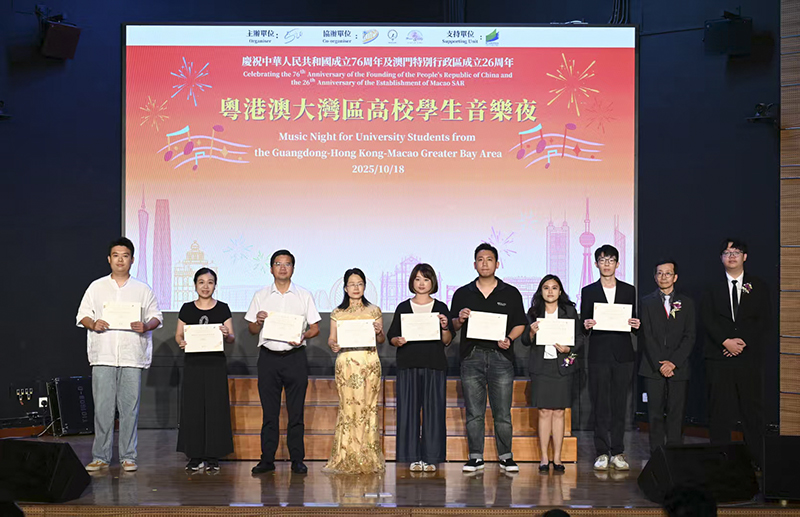 10月18日,应澳门旅游大学邀请,我院精心挑选出三名优秀学生柳萌、黄鹏臻、杨钰滨,并由学院党委书记欧卫军带队,赴澳门参加“庆祝中华人民共和国成立76周年及澳门特别行政区成立26周年粤港澳大湾区高校学生音乐夜”演出交流活动。演出共有18支高校队伍参加,活动取得圆满成功,主办方为参与学校颁发了感谢状。此次是我校连续第5年受邀参加该活动。