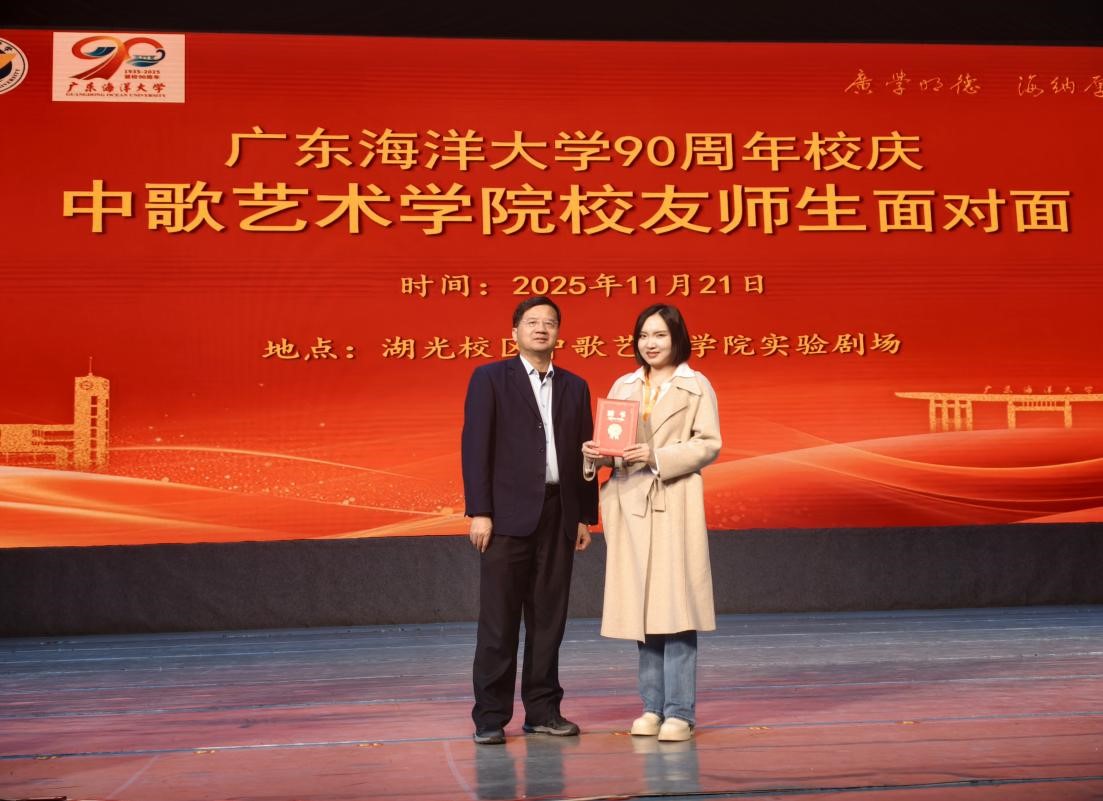 活动尾声,我院党委书记欧卫军为校友王莉颁发“广东海洋大学创新创业指导师”聘书。翟周在总结中鼓励学子以校友为榜样,坚守艺术审美初心,勇于跨界探索实践,传承海大“广学明德、海纳厚为”的校训精神,在艺术与职业的融合之路上稳步前行。