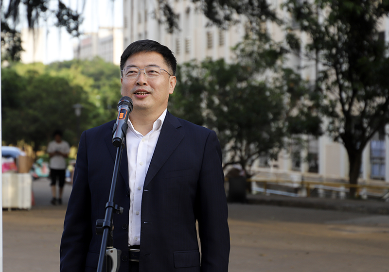 学校党委书记杨洲发表讲话。他代表学校党委和全体师生员工,向圆满完成国家任务、为校争光的师生表示最热烈的祝贺和最诚挚的感谢。杨洲指出,参演师生克服困难、连续作战,用专业和热情为全国体育盛会增添了青春亮色,用实际行动诠释了“青春闪耀全运,荣光共筑海大”的深刻内涵。他强调,此次展演是我校将艺术实践融入国家大事、将个人成长对接时代需求的生动体现,是一堂鲜活的“大思政课”。他希望全体师生将这份荣耀转化为前进动力,发扬全运精神,积极投身学校发展和粤港澳大湾区建设。