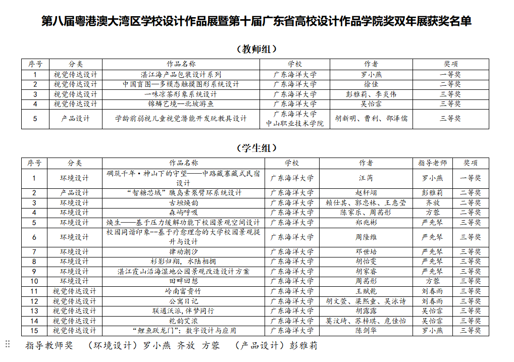 在刚刚结束的第八届粤港澳大湾区学校设计作品展暨第十届广东省高校设计作品学院奖双年展评选中,我院师生凭借扎实专业功底与创新设计理念,在全省众多高校作品中脱颖而出,荣获一等奖2项、二等奖4项、三等奖14项,罗小燕、齐放、方蓉、彭雅莉4位老师获评优秀指导教师。